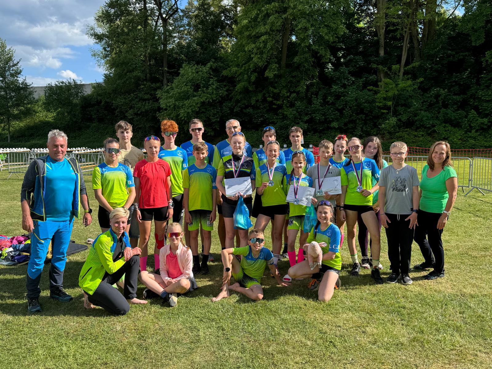 Na počátku letní sezóny jsme uspořádali regionální závod v Dolním Rychnově v areálu Za kovárnou, kde se radovali z medailí Sylvinka, Petruška, Adam a Adélka a další naši závodníci si vylepšili osobní rekordy. Následovaly dvoudenní závody v Liticích, kde jsme získali řadu medailových umístění jak v žactvu, tak také v dorostu, téměř všichni dosáhli na svá osobního maxima. Tento úspěšný vstup do letní části sezony vyvrcholil vítězstvím naší trojice Viki, Lea a Lukáš ve střeleckém souboji v rámci 2. Českého poháru v letním biatlonu dorostu, kde mezi 23 tříčlennými týmy z celé ČR suverénně vystříeli zlato. Vysokou kvalitu našich sportovců potvrdili 4. místem také František, Eliška a Pavel. Ani naše žactvo se nenechalo zahanbit a na MČR ve Starém Městě pod Landštejnem zásluhou Sylvinky získalo stříbrnou medaili ve vytrvalostním závodě. Úspěšný víkend nakonec ozdobili skvělým 3. místem Adam a Jáchym v závodě tříčlenných štafet. Skvělým úspěchem také bylo nečekané 4. místo v klidové střelbě na 15 m Doubravky s nástřelem 189 z 200 možných bodů při 1. kole ČP poháru žactva v Bystřici pod Hostýnem.